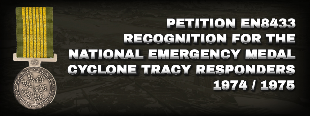 Petition Reason This e-petition aims to attain recognition for service by Royal Australian Navy, Australian Army and Royal Australian Air Force members, Police, St John Ambulance Association, Red Cross, Salvation Army, and civilians in disaster relief operation following the destruction of Darwin caused by Cyclone Tracy. Approximately 8,000 personnel operated from 25 December 1974 to 30 June 1975, evacuating people, stabilising buildings, bringing in vital supplies, and dealing with casualties. This e-petition argues the National Emergency Medal should be bestowed on all uniformed people involved. The Medal, struck in 2011, was immediately made retrospective for operations in bushfires back to 2009. However, despite several approaches to previous governments to recognise personnel in Cyclone Tracy recovery operations, their reasoning was “the burden of providing historical information for personnel, including researching and sourcing it makes retrospectivity unfeasible.” The petition emphasizes that medals are not merely decorations, but symbols of Australia’s gratitude, respect, and acknowledgment of service and sacrifice. Petition Request We therefore ask the House to request the National Emergency Medal Committee to reconsider whether Cyclone Tracy should be declared a nationally significant emergency for the purpose of the National Emergency Medal, noting that feasibility cannot be known until award recognition is tried. The services involved have personnel in place who can access their records. Your petitioners are capable of assessing other personnel who might apply. If this course of action is not possible, the petitioners request that the Government initiates a process for creation of a totally new medal in Australia – The Cyclone Tracy Medal. |